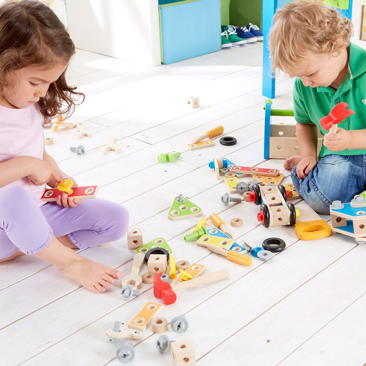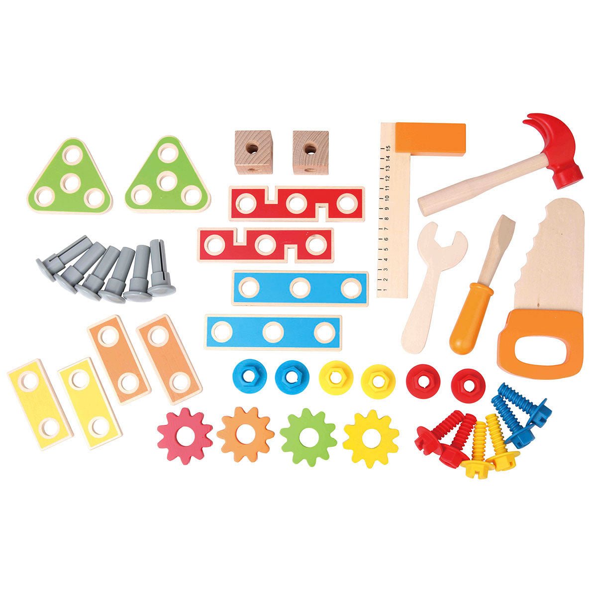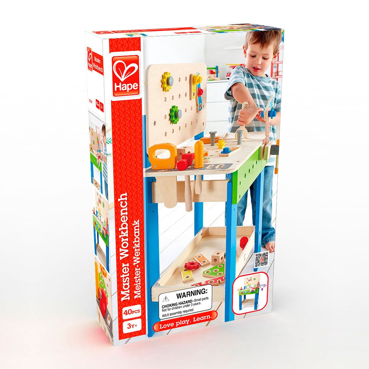 Con este banco de aspecto profesional, los constructores y constructoras con grandes ideas pueden demostrar su habilidad. Las herramientas y demás útiles están siempre a mano en las estanterías y compartimentos. El banco está diseñado para que las piezas puedan fijarse directamente a la misma, pero también pueden construirse estructuras por separado. Pueden encontrar todo lo que necesitan para trabajar en el banco de trabajo. Los estantes y compartimentos del banco de madera de alta calidad tienen suficiente espacio de almacenamiento para sierras, destornilladores y similares. Los utensilios también se pueden guardar en el compartimento de almacenamiento. El banco de trabajo está diseñado para que las piezas se puedan unir directamente a la caja. Por ejemplo, un engranaje se puede sostener directamente en la pared de madera. El conjunto consta de un total de 35 partes y está aconsejado para chicos a partir de los 3 años. Interactuá con tus hijos nombrando las diferentes herramientas que usan y explicales para qué sirve cada herramienta.