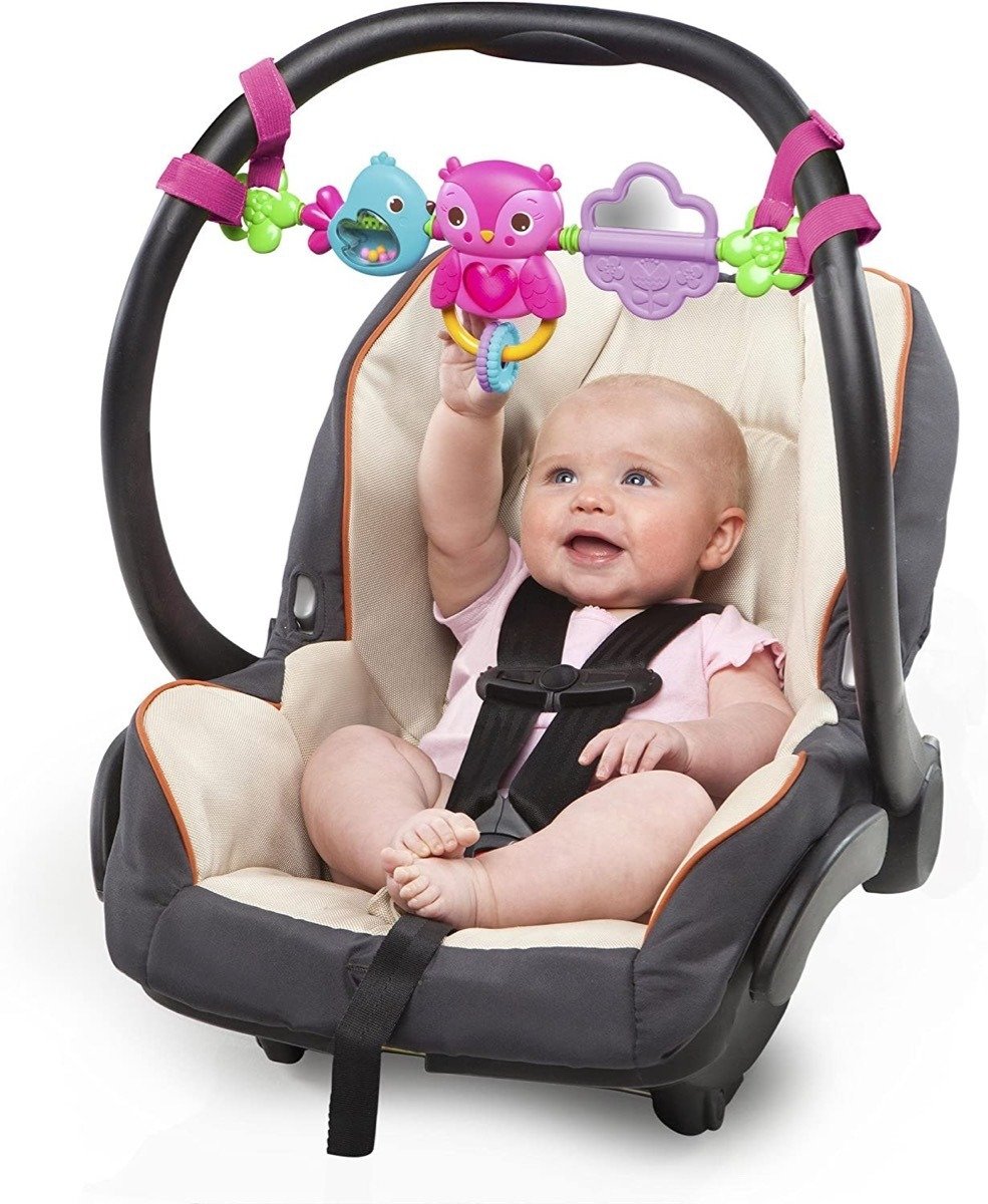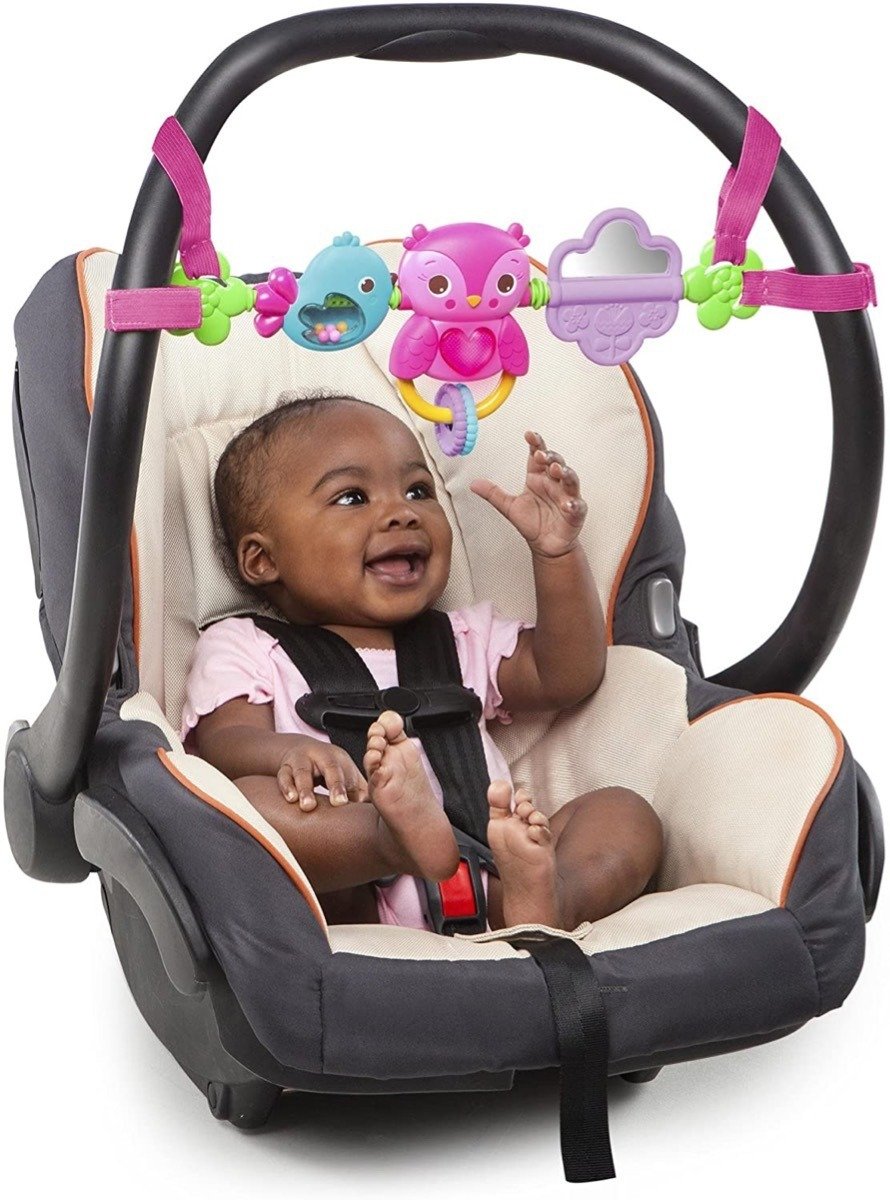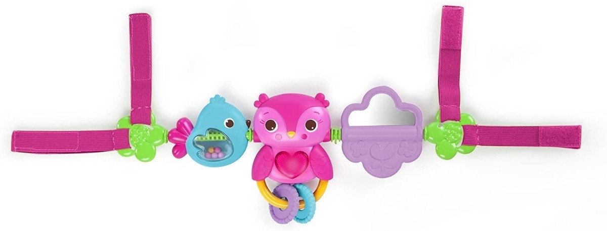 Ahora el bebé puede disfrutar de un jardín de actividades sin importar a dónde vaya. Bright Starts Pretty in Pink Busy Birdie Carrier Toy Bar se conecta a la mayoría de los portabebés para mantener al bebé entretenido mientras viaja. Empuje la barriga del pequeño búho rosa para ver luces y escuchar melodías alegres. El pequeño pájaro azul gira y las cuentas de colores se mueven y suenan para entretener al bebé. La paleta giratoria es perfecta para la diversión de autodescubrimiento e incluye un perseguidor de cuentas para mantener ocupadas las manos pequeñas. Mantenga a su bebé felizmente entretenida cuando viaje, vaya de compras y más.