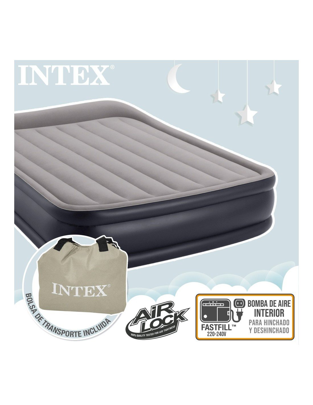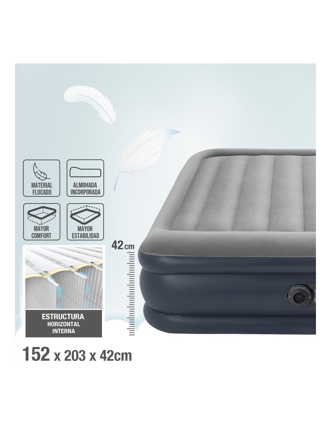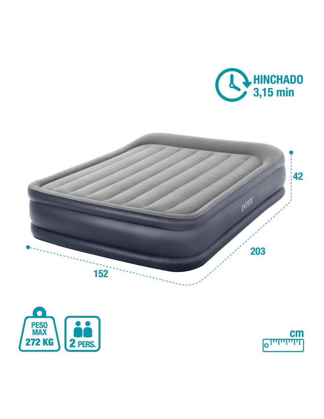 Fácil inflado y desinflado: incorpora inflador eléctrico embutido para inflar y desinflar rápidamente, también se puede inflar con un inflador manual o eléctrico (no incluido). Se infla en un tiempo aproximado de 2,15 min.