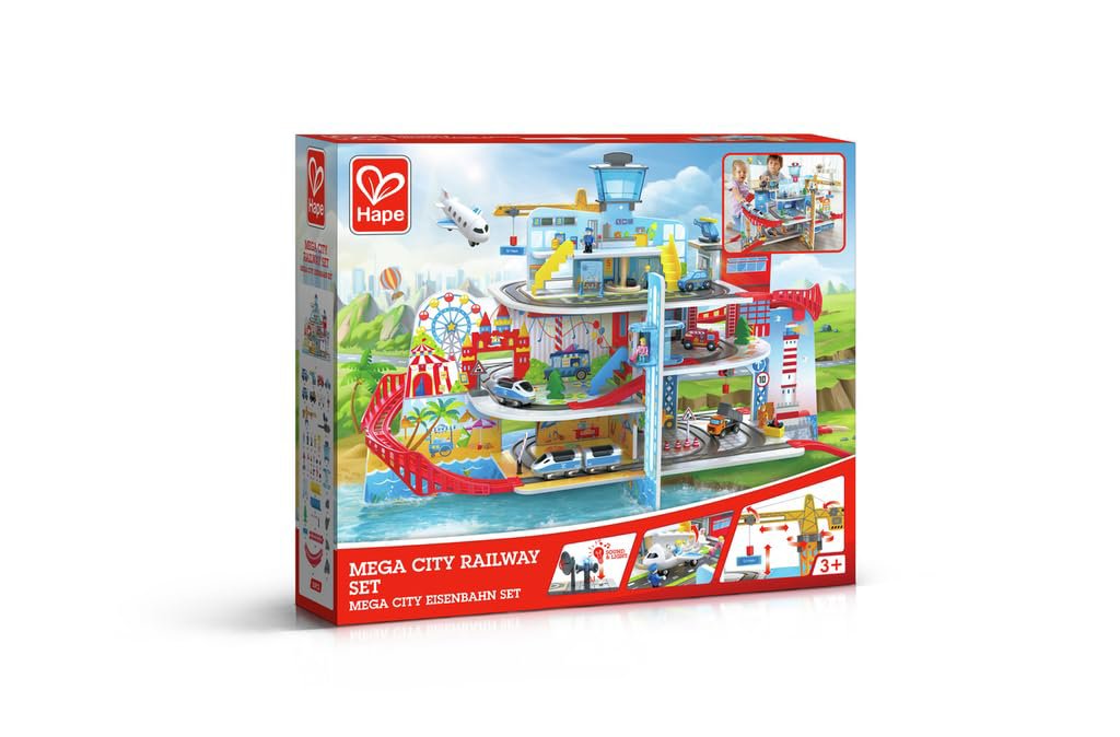 ALTA CALIDAD: Los juguetes Hape son fabricados con plástico amigable para el medio amnbiente y de la más alta calidad, garantizando durabilidad. Incluye: Pista para tren, tren, torre de vigilancia, estación de policía, escaleras, un acensor, avión, camión de bomneros, cambion con bloque de carga, disco giratorio, grúa y figuras