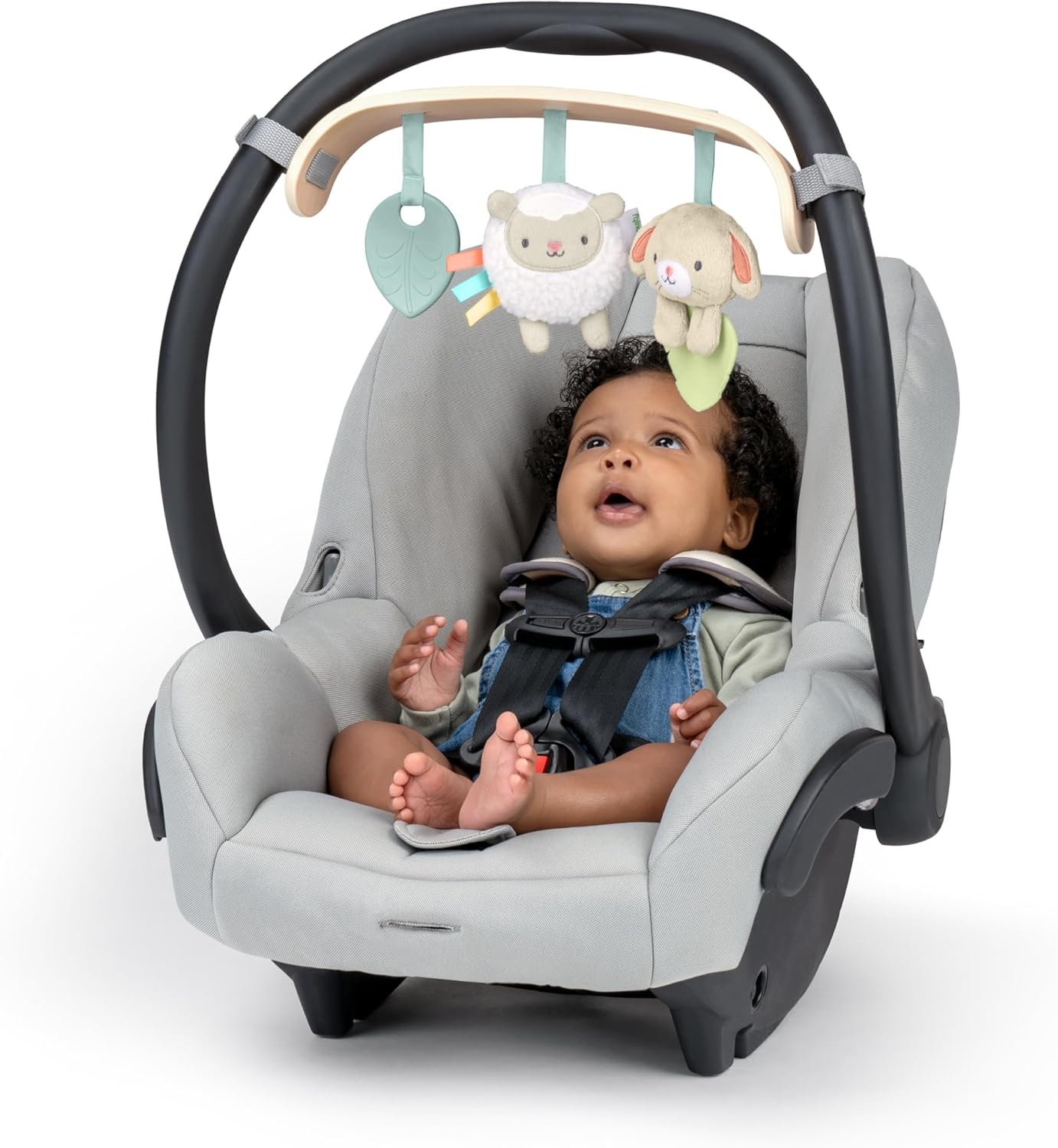 Ingenuity Soothing Essentials – Barra de juguetes transportadora de madera, inspirada en Montesorri, 3 juguetes extraíbles, para edades de 0 a 12 meses