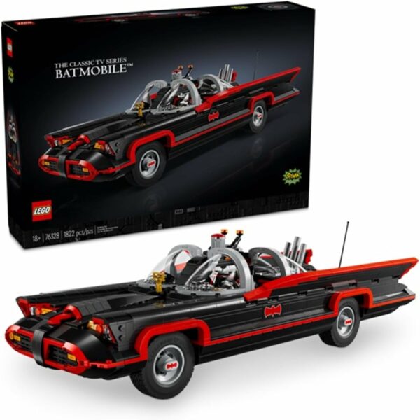 Este es el set LEGO DC Batman: Batimóvil de la Serie Clásica de TV (76328). Es un kit de construcción coleccionable para fans adultos de Batman y la cultura pop de los años 60. El set incluye una réplica del icónico Batmóvil de la serie de televisión de 1966, con detalles auténticos como un parabrisas moldeado, ruedas giratorias, y un maletero que se abre para revelar la Bat-Computadora. También viene con una minifigura de Batman al estilo de 1966. El modelo mide 50 cm de largo, 18 cm de ancho y 14 cm de alto, lo que lo convierte en una pieza de exhibición impresionante. El set contiene 1822 piezas y es adecuado para constructores experimentados.