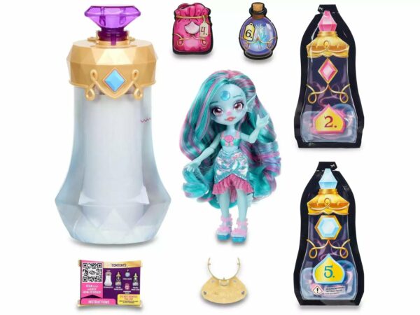 Incluye: 1 recipiente unbonxing con forma de botella de perfume, 1 muñeca sorpresa, 1 set de ingredientes para pócima (de un solo uso), 1 manual de instrucciones en varios idiomas y 1 guía para coleccionistas.