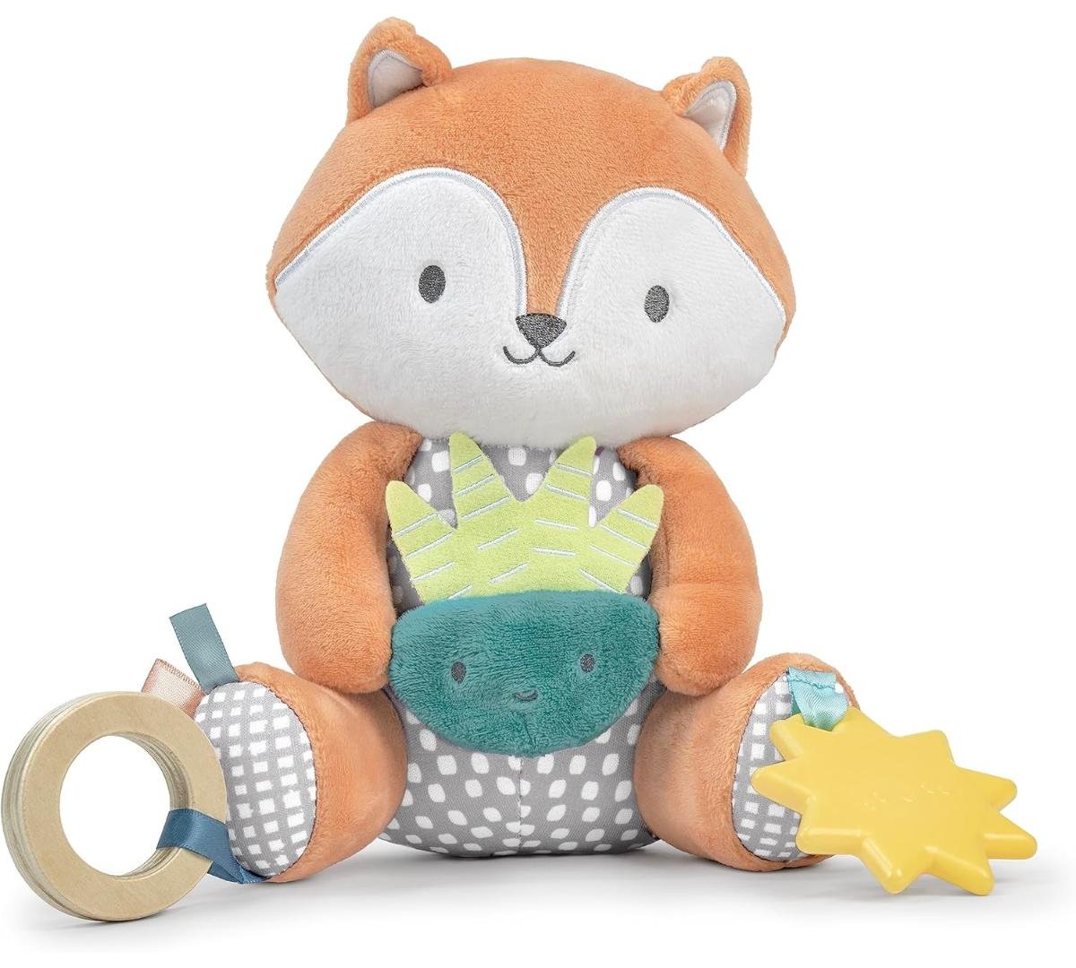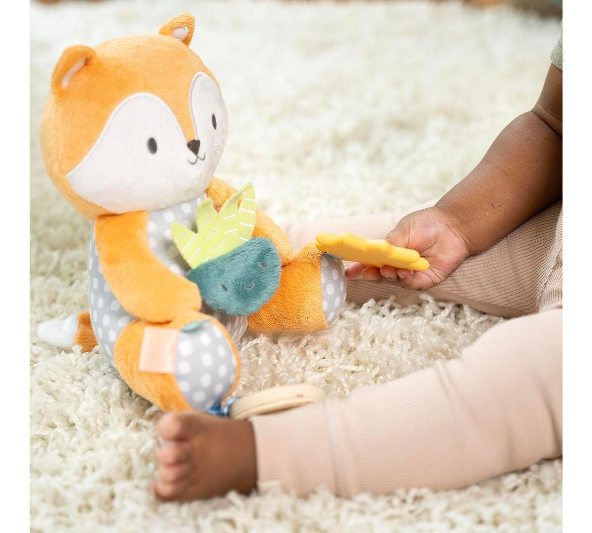 Conocé a Kitt, el tierno zorrito, ideal para acompañar al bebé en casa o de paseo. Suaves telas premium, texturas y sonidos crujientes estimulan los sentidos y la curiosidad. Incluye un mordillo con forma de sol, libre de BPA, que ayuda a aliviar las encías. Cuenta con una presilla de tela para colgar fácilmente del cochecito o portabebé.