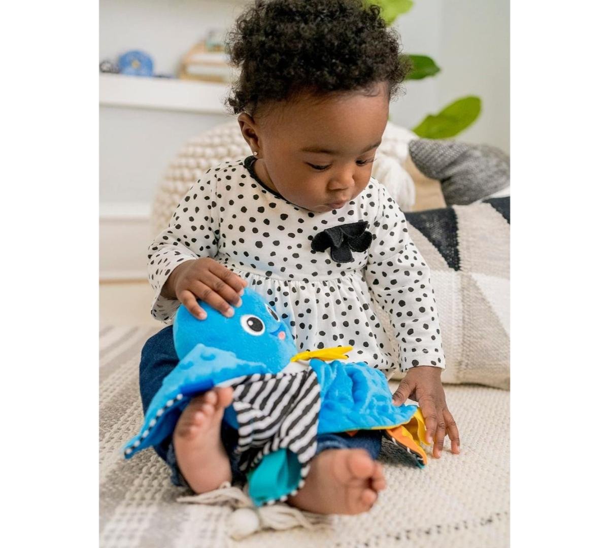 6 melodías clásicas reconfortan al bebé y los colores brillantes y de alto contraste estimulan el sentido de la vista del bebé. Las texturas y cintas variadas alientan a los dedos pequeños a explorar y promover la estimulación táctil. Apropiado para bebés desde recién nacidos en adelante.