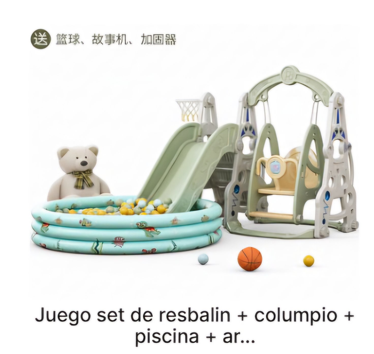 Observe cómo florece su imaginación y crecen sus habilidades en este juego todo en uno.Fácil de montar, este juego es un complemento perfecto para cualquier patio, sala de juegos o guardería. Ofrece una variedad de actividades que promueven el desarrollo físico, las habilidades cognitivas y la interacción social.Con un resbalín suave y seguro, los niños pueden experimentar la emoción de deslizarse hacia abajo mientras desarrollan sus habilidades motoras. Las escaleras antideslizantes garantizan una escalada segura y estable, fomentando la exploración y la aventura. El robusto columpio ofrece un asiento cómodo y permite a los niños volar alegremente por el aire. El aro de basquetbol incluido añade un elemento extra de diversión y promueve la actividad fisica